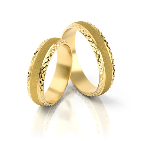 Ruční výroba v klenotnické dílně Gremari, jedinečné klasické snubní prsteny z 14K (585) zlata, jsou nadčasovým symbolem věčné lásky. Prsten, široký 5 mm a tlustý 1,3 mm, vypadá na ruce krásně, je nenápadný a skvěle ladí s ostatními šperky, jako jsou náramky nebo prsteny s drahými kameny, či zásnubní prsten.