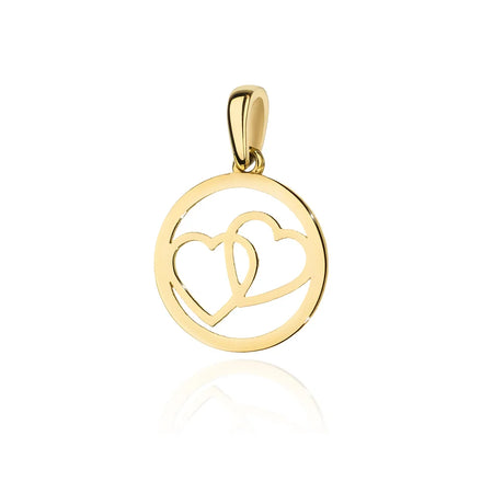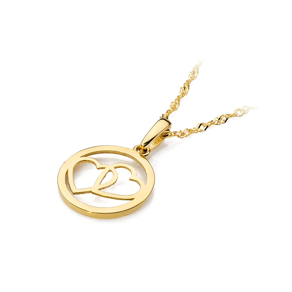 Zlatý náhrdelník s přívěsky ve tvaru spojených srdcí v kruhu na kotvovém řetízku
