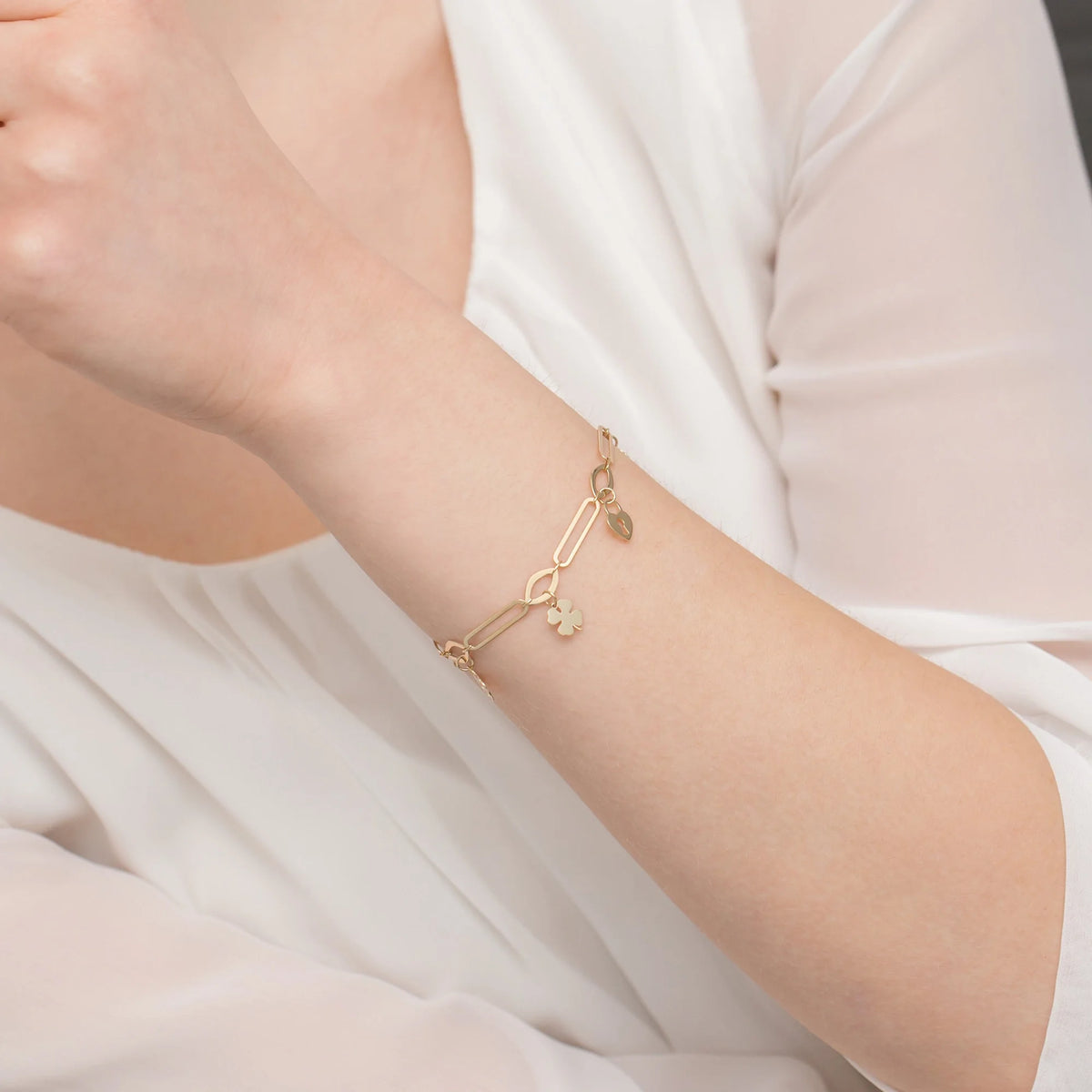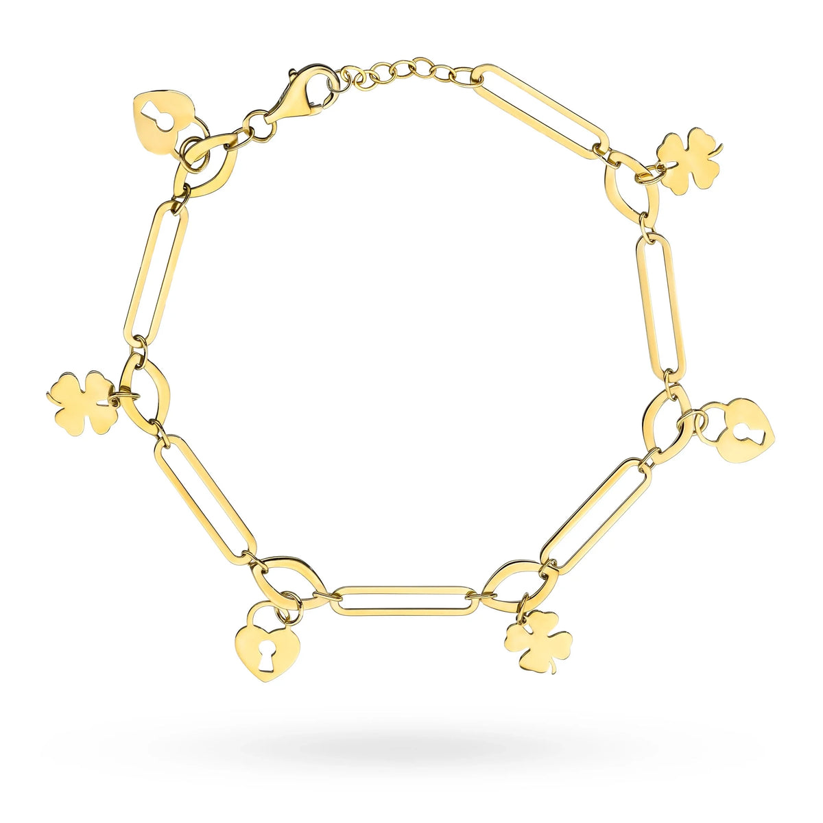 Bracelet en or avec maillons larges et breloques cadenas et trèfle