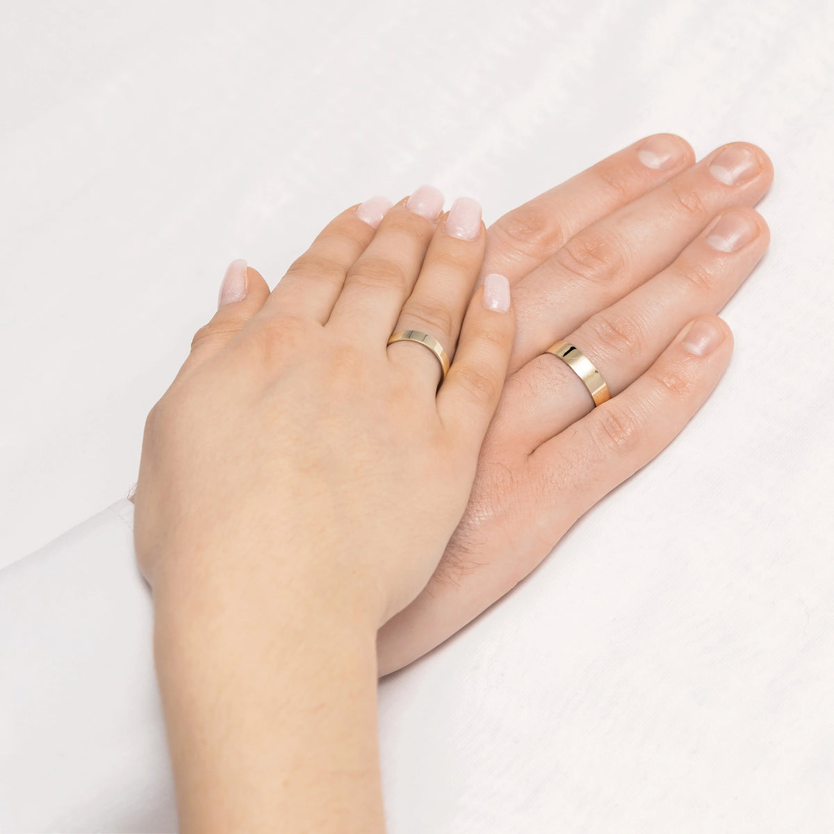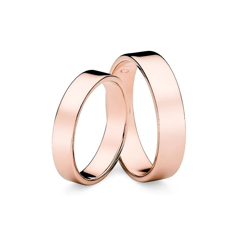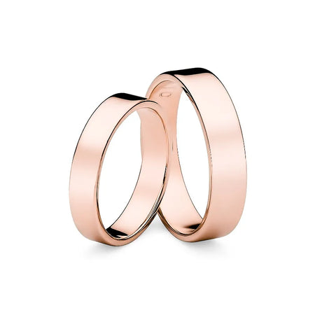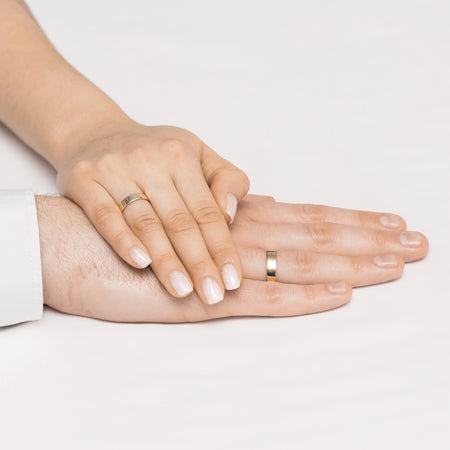 Classic Flat Gold Wedding Bands Rings 4 and 5 mm Handcrafted in the Gremari jewelry workshop, unique classic wedding rings made of 14K (585) gold, are a timeless symbol of everlasting love. The ring, 4 and 5mm wide and 1.2mm thick, looks beautiful on the hand, is subtle, and goes perfectly with other jewelry pieces, such as bracelets or rings with precious stones, or an engagement ring.We offer gold wedding band in three precious shades: classic yellow gold delights with its warm glow and is a timeless symbol of marriage; elegant white gold has a modern, cool, mirror-like shine reminiscent of platinum; while romantic rose gold captivates with its subtle, warm, and fashionable hue. Each pair of wedding rings is made in our workshop according to the customer's order. It is possible to personalise them further by adding an engraving with your own text. We pack the wedding rings in an elegant jewellery box, matching the character of your ceremony.