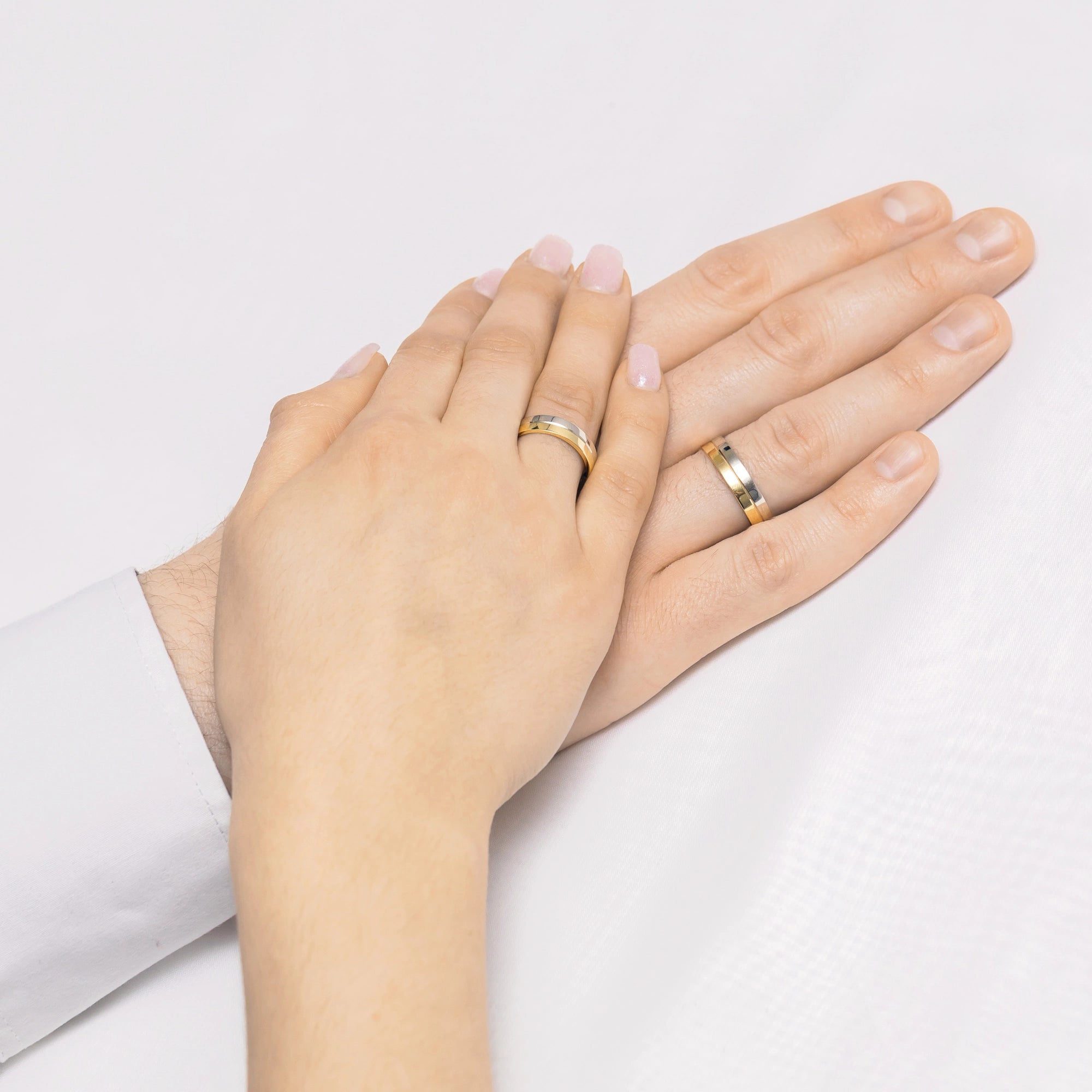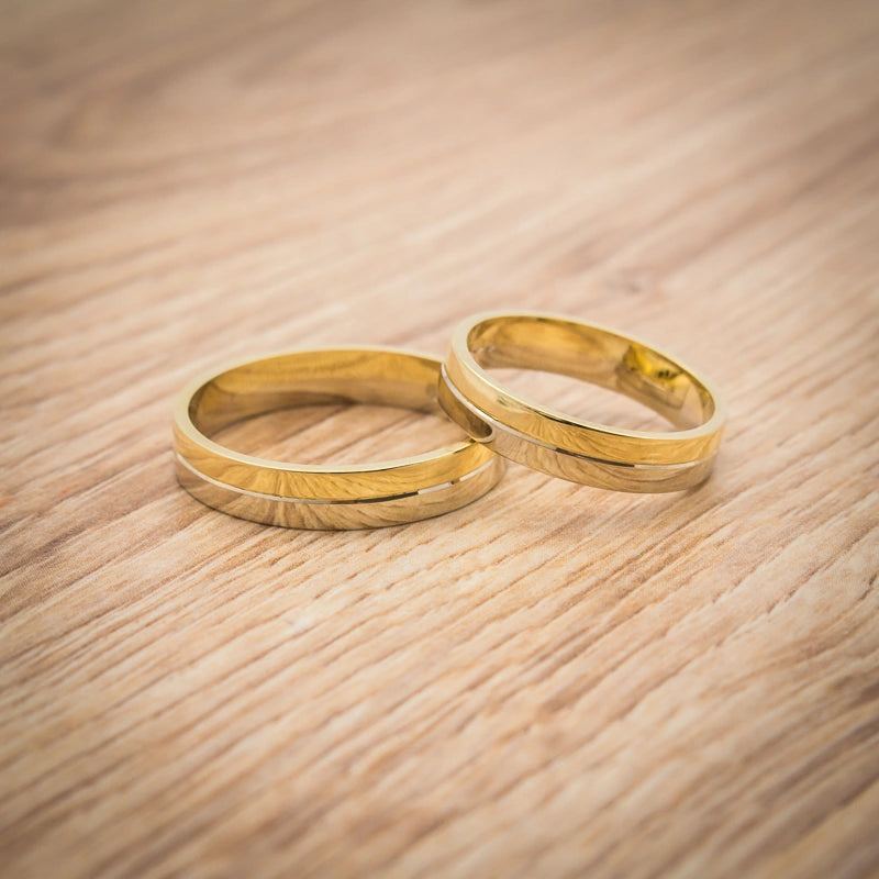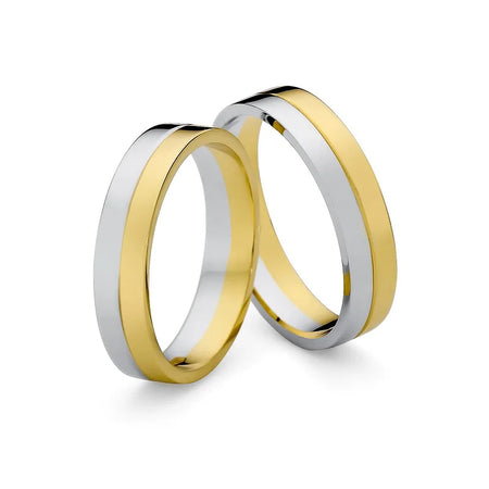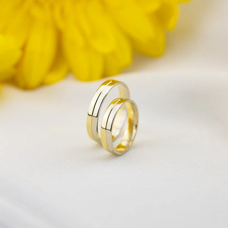 Flat Two-color gold Wedding Bands Rings 5mm Handcrafted in the Gremari jewelry workshop, unique classic wedding rings made of 14K (585) combination of white and yellow gold, are a timeless symbol of everlasting love. The ring, 5mm wide, looks beautiful on the hand, is subtle, and goes perfectly with other jewelry pieces, such as bracelets or rings with precious stones, or an engagement ring. Each pair of wedding rings is made in our workshop according to the customer's order. It is possible to personalise them further by adding an engraving with your own text. We pack the wedding rings in an elegant jewellery box, matching the character of your ceremony.