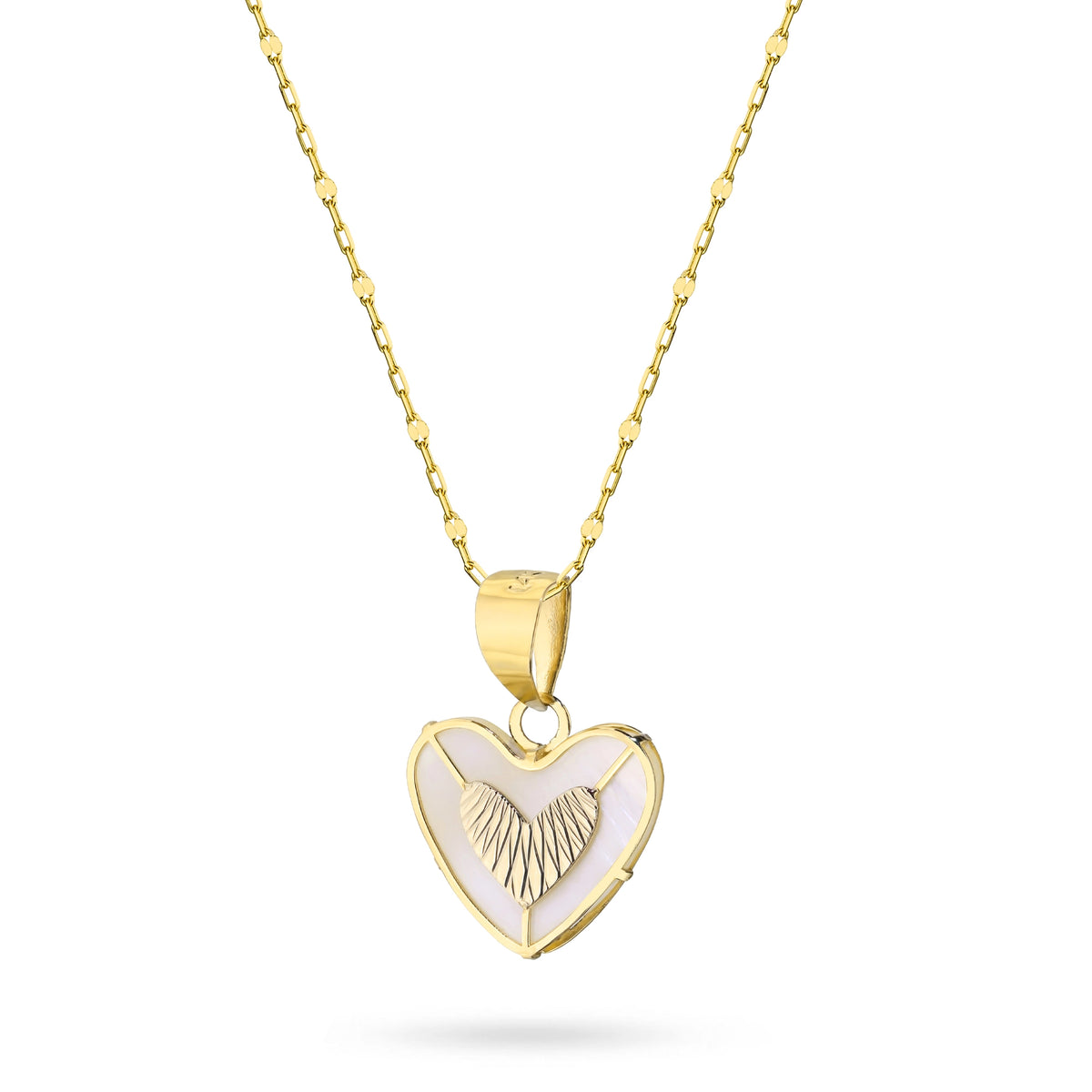 Gold Necklace with Diamond-Cut Heart-in-Heart Pendant with White Enamel