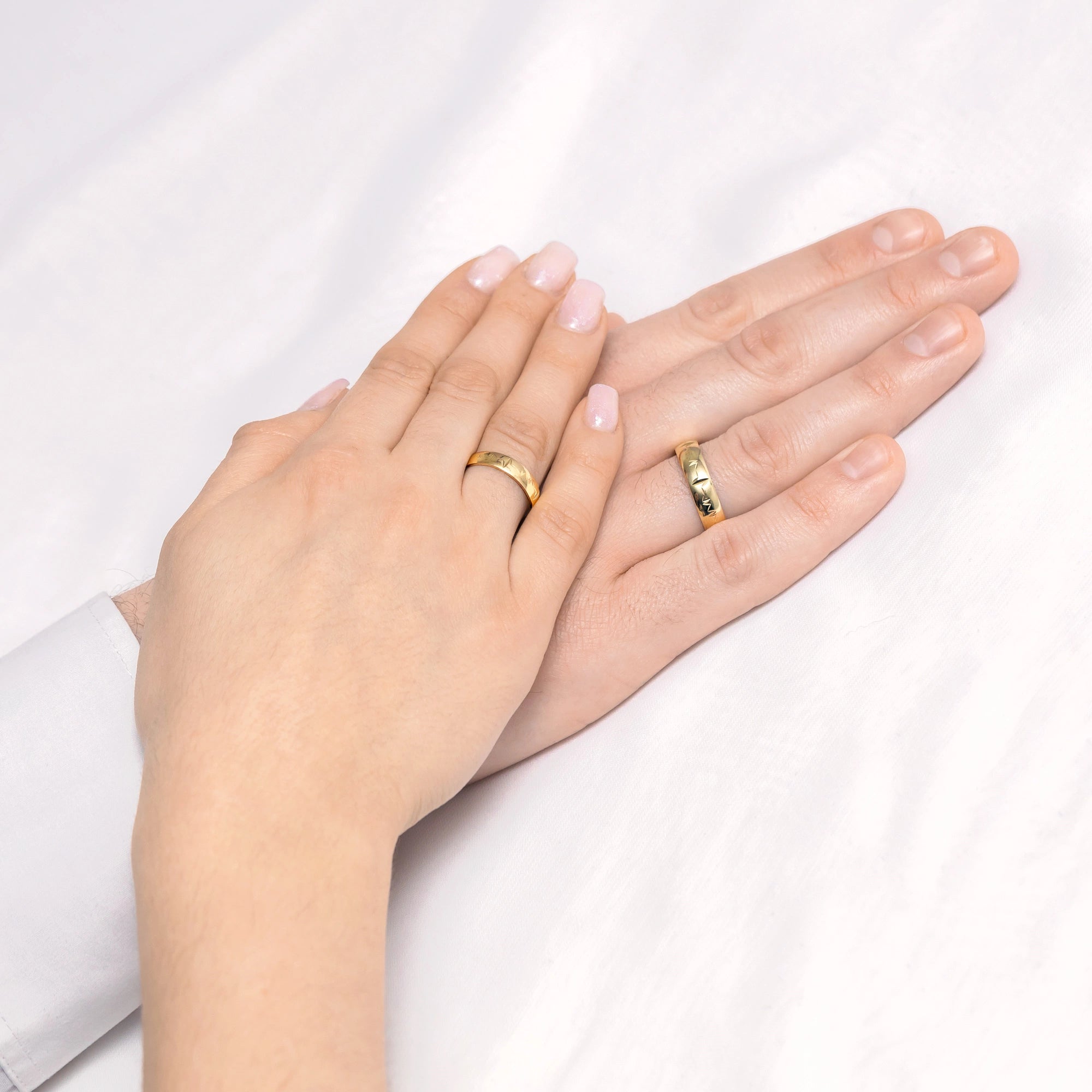 Yellow gold Wedding Bands Rings Pulse 4 and 5 mm Handcrafted in the Gremari jewelry workshop, unique classic wedding rings made of 14K (585) gold, are a timeless symbol of everlasting love. The ring, 4 and 5mm wide, looks beautiful on the hand, is subtle, and goes perfectly with other jewelry pieces, such as bracelets or rings with precious stones, or an engagement ring. Each pair of wedding rings is made in our workshop according to the customer's order. It is possible to personalise them further by adding an engraving with your own text. We pack the wedding rings in an elegant jewellery box, matching the character of your ceremony.
