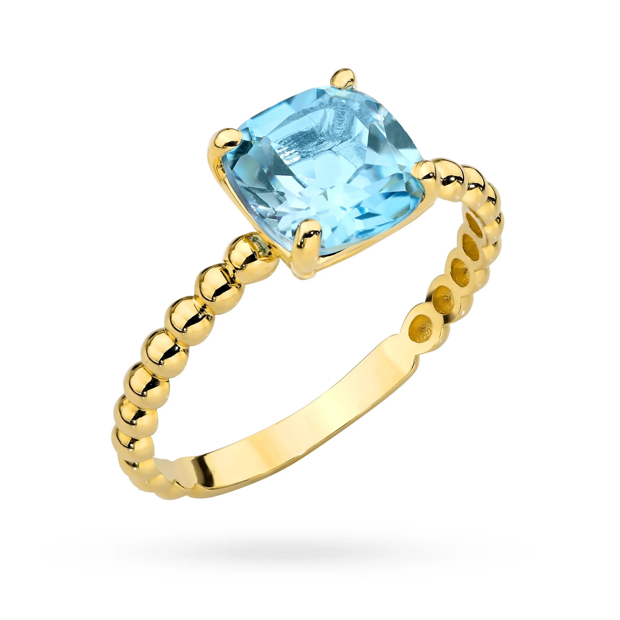 Prsteň zo zlatých korálok so štvorcovým modrým topásom