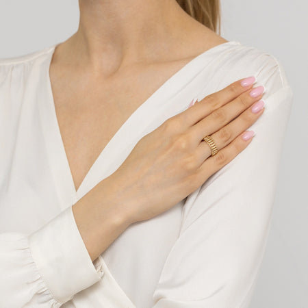 Zlatý prsteň Oválny vzor Ručne vyrobený v tradičnej zlatníckej dielni Gremari, tento zlatý prsteň z 14K zlata s puncovým označením 585 je očarujúcim, jemným doplnkom, ktorý zvýrazňuje krásu vašich rúk. Jemný dizajn robí z tohto zlatého prsteňa dokonalý doplnok k inému šperku, ako sú diamantové prstene a zlaté náramky. Zlatý prsteň je podstatou elegancie a triedy. Je to univerzálny doplnok, ktorý môžete nosiť každý deň aj pri špeciálnych príležitostiach. Vyrobený z najkvalitnejšieho zlata, ohromuje svojím nadčasovým leskom a odolnosťou. Je to dokonalý spôsob, ako zdôrazniť svoj štýl a pridať akémukoľvek outfitu nádych luxusu. Zlatý prsteň Gremari je zabalený v elegantnej krabičke, ktorá je ideálna na darovanie. Súčasťou je aj visačka so šperkom, ktorá uvádza ryzost, hmotnosť a symbol kovu – aj keď je to darček na poslednú chvíľu, máte to vyriešené!